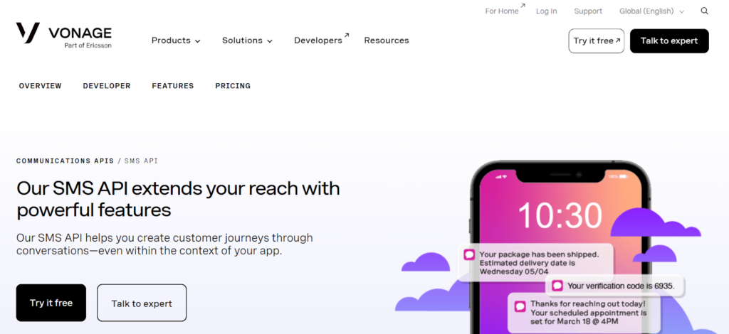 Vonage offers a Verify API that supports OTP delivery via SMS and voice. It provides real-time delivery tracking and analytics tools to monitor verification success. Vonage is often used by enterprises that require integrated communication services and scalable global infrastructure.